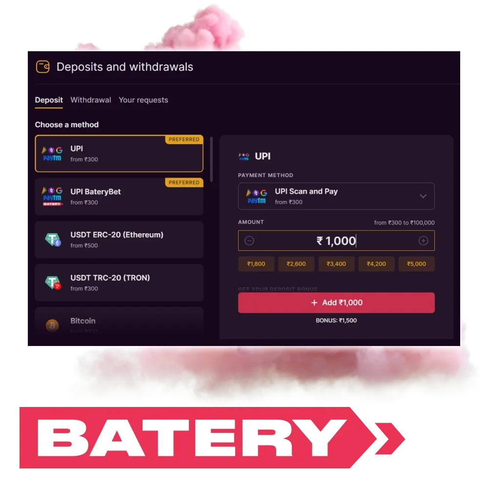 Most payment systems are available for withdrawing funds. This includes both e-wallets and cryptocurrencies. The minimum withdrawal amount is 500 INR. The exact limits depend on the selected payment system. Batery does not charge any fees. However, they may be charged by payment services.